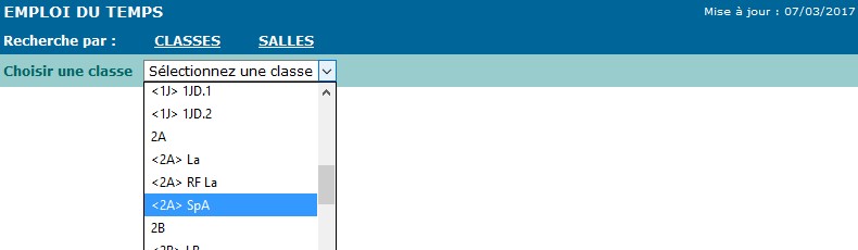 Cette partie du site du Collège fournit aux professeurs, aux éducateurs et à la direction un accès permanent à la version la plus récente des horaires des classes, des options de chaque classe, et des salles de cours (plans disponibles ici) . Elle est mise à jour en permanence en fonction des changements, et est donc largement plus fiable que l'horaire "physique" qui n'est pas maintenu à jour en ce qui concerne les salles de classes au-delà de la rentrée.